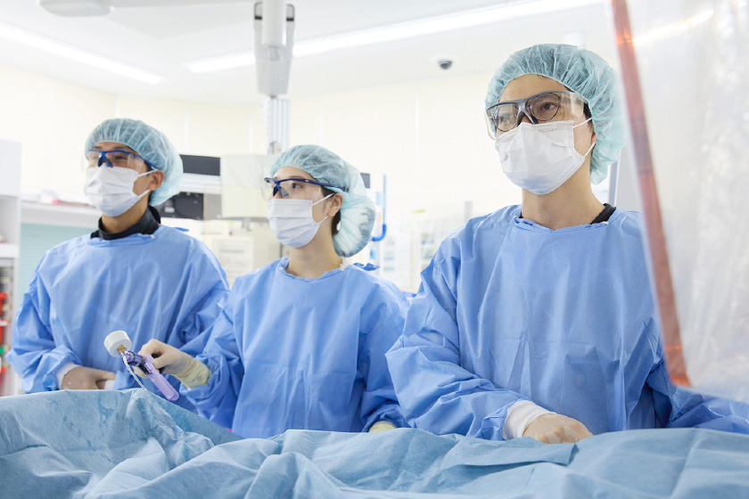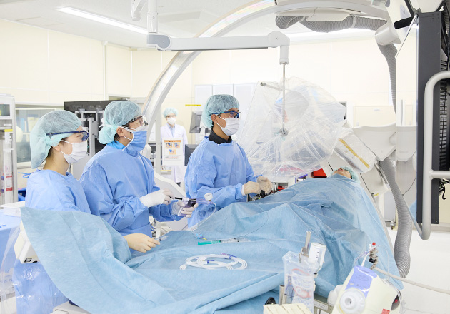 虚血グループは、冠動脈疾患および末梢動脈疾患を含む動脈硬化性疾患の外来および入院診療を担当しています。三次救急センターである当院では、最重症である院外心停止若しくは院外心停止蘇生後患者の受け入れが多く、低心機能で不安定な血行動態を有する患者に対し、適切にECMO、Impellaなどの補助循環装置を使用し、救命に当たっています。病変性状についても、多枝病変、高度石灰化病変、慢性完全閉塞といった複雑冠動脈病変を有する患者が多いことが特徴です。イメージングデバイス(IVUS,OCT/OFDI)により正確に病変の性状を把握し、デバイルキングデバイス(Rotablator, Diamondback 360, DCA)を駆使して、安全かつ最適な治療に取り組んでいます。さらに高度石灰化病変に対して衝撃波を用いた治療デバイスであるIntravascular Lithotripsy(IVL)も導入し、最先端のカテーテル治療に取り組んでいます。また近年注目されている冠微小血管障害(coronary microvascular dysfunction: CMD)の評価も行い、より的確な診断と最適な治療を提供してます。